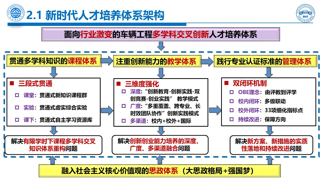 多学科交叉、强基础、重实践、促融合的新工科课程体系重构是人才培养的关键,该成果基于车辆工程专业特点,开展虚实结合的贯通式教学模式,解决了汽车内涵与外延急速扩张背景下的有限学时与人才综合能力培养之间的矛盾。