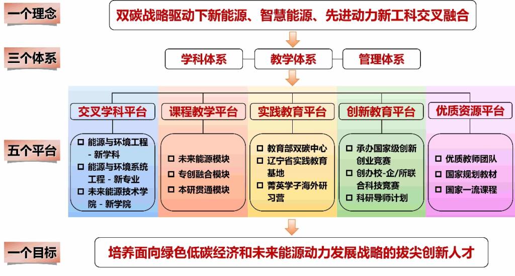 国家双碳战略以及未来能源发展对推进传统能源动力类专业人才培养转型升级,提高碳达峰碳中和相关专业人才培养质量提出了新的要求。大连理工大学紧密结合国家新兴能源产业需求,超前谋划、率先探索传统能源动力领域专业人才培养体系改革,于2004年和2008年分别设立了“能源与环境工程”新学科和“能源与环境系统工程”新专业,与中科院工程热物理所实施科教协同育人,率先成立了“未来能源技术学院”。逐步形成了能源动力类新工科“1135”创新人才培养体系。
